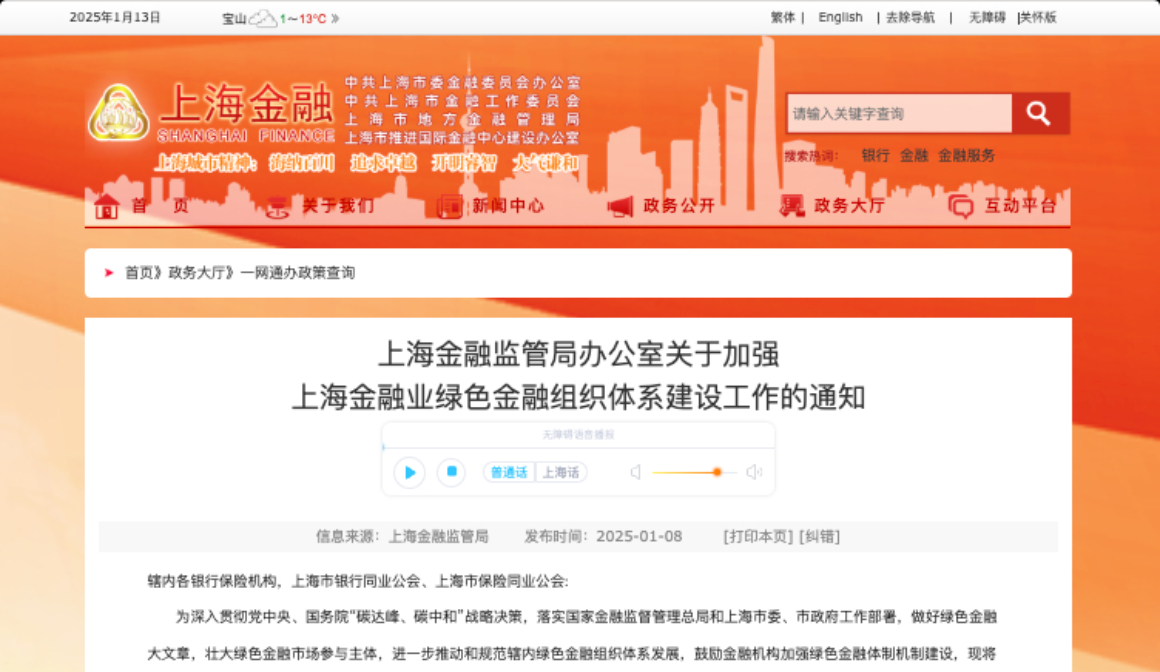 上海金融监管局办公室关于加强上海金融业绿色金融组织体系建设工作的通知辖内各银行保险机构,上海市银行同业公会、上海市保险同业公会: 为深入贯彻党中央、国务院“碳达峰、碳中和”战略决策,落实国家金融监督管理总局和上海市委、市政府工作部署,做好绿色金融大文章,壮大绿色金融市场参与主体,进一步推动和规范辖内绿色金融组织体系发展,鼓励金融机构加强绿色金融体制机制建设,现将有关事项通知如下。查看更多 -